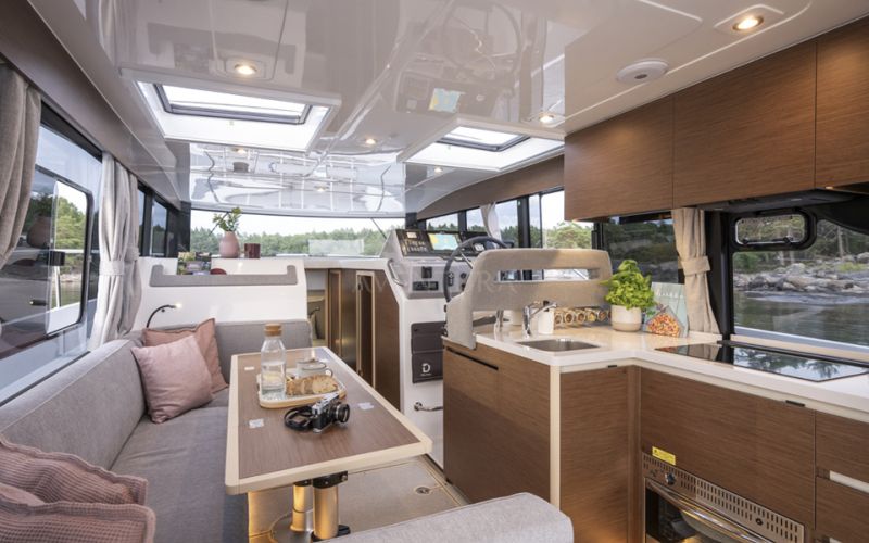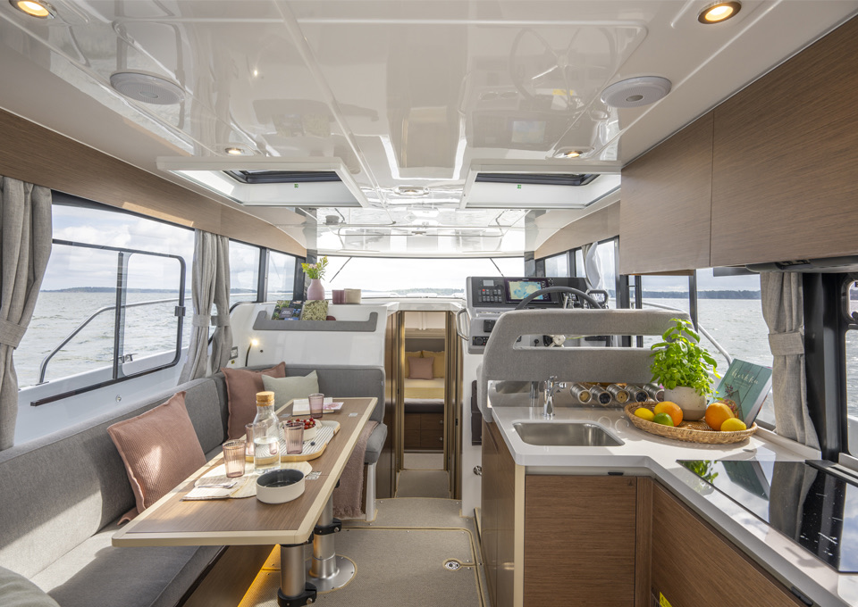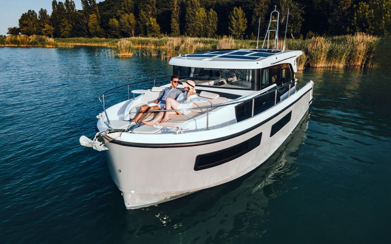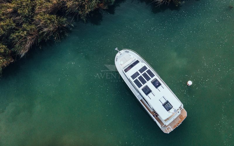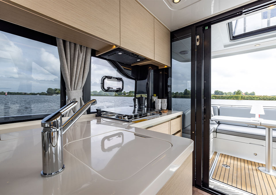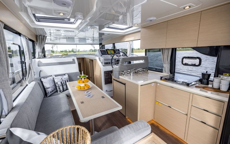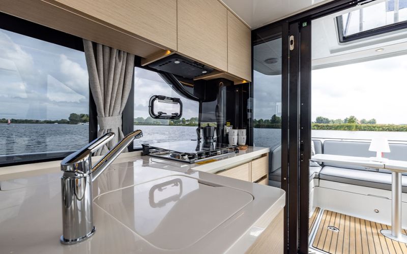 Life on board is centred around convivial shared spaces that flow naturally between exterior and interior. The cockpit lounge opens directly onto the saloon, so all passengers remain connected whether they choose to sit inside or outside. A wetbar aft, complete with barbecue and sink, allows the chef to stay involved in the conversation while preparing meals, without blocking access routes. On deck, practical features such as multiple solar panels, sliding roof hatches, folding antennas and a folding radar mast underline the boat's focus on autonomy, practicality and ease of operation in inland and coastal waters.