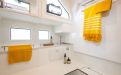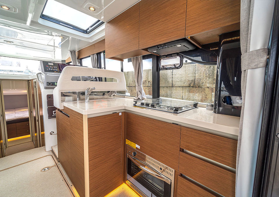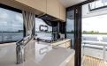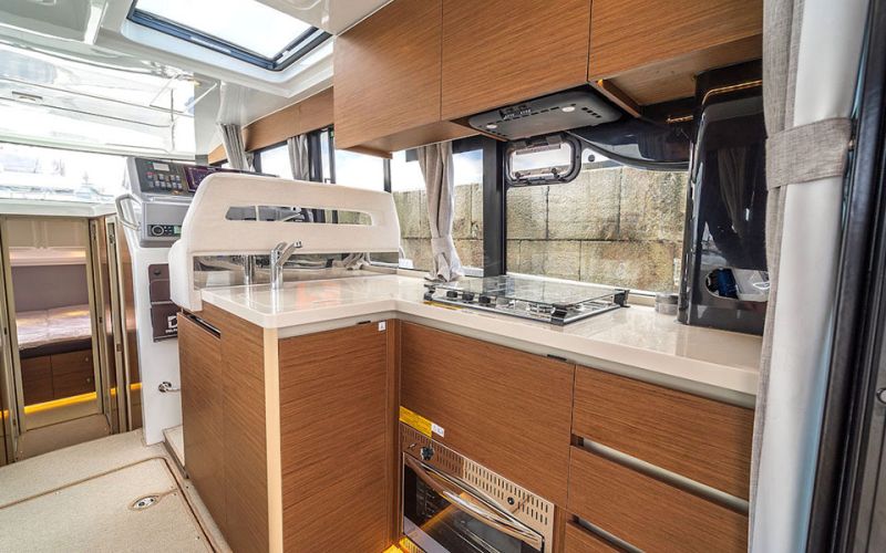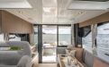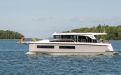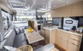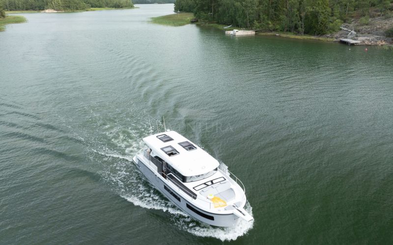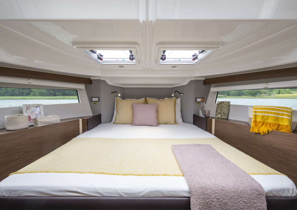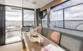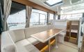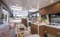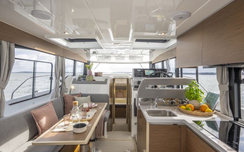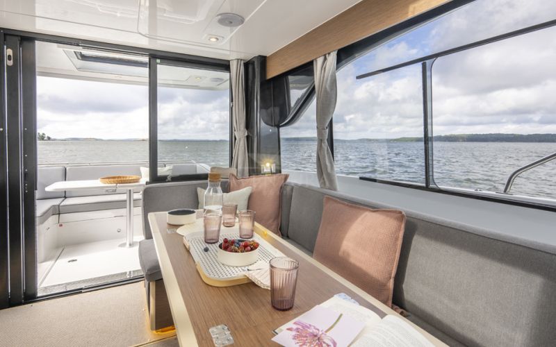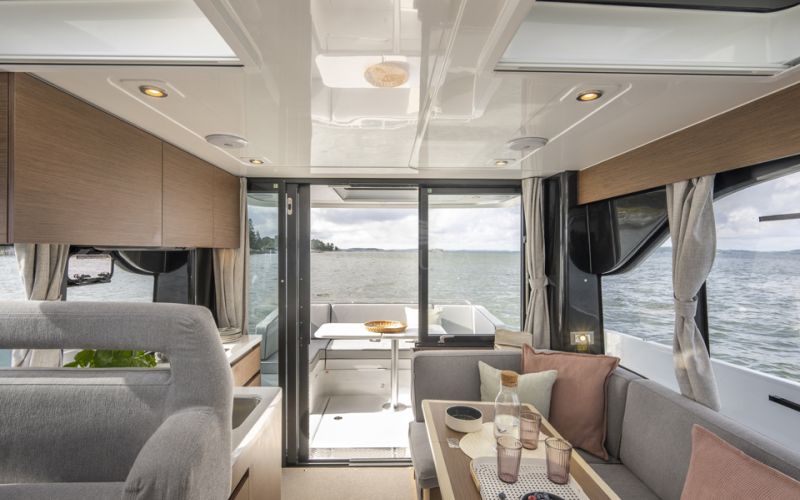 Life on board is centred around convivial shared spaces that flow naturally between exterior and interior. The cockpit lounge opens directly onto the saloon, so all passengers remain connected whether they choose to sit inside or outside. A wetbar aft, complete with barbecue and sink, allows the chef to stay involved in the conversation while preparing meals, without blocking access routes. On deck, practical features such as multiple solar panels, sliding roof hatches, folding antennas and a folding radar mast underline the boat's focus on autonomy, practicality and ease of operation in inland and coastal waters.