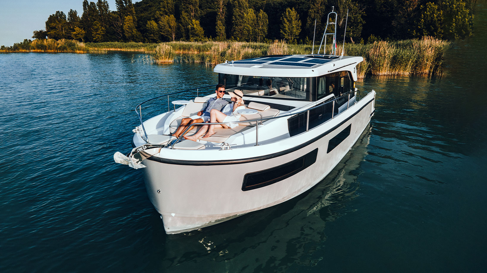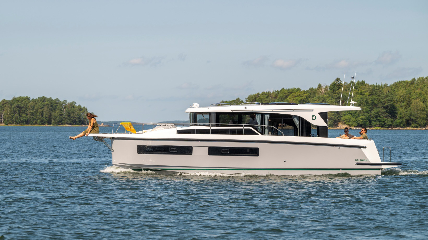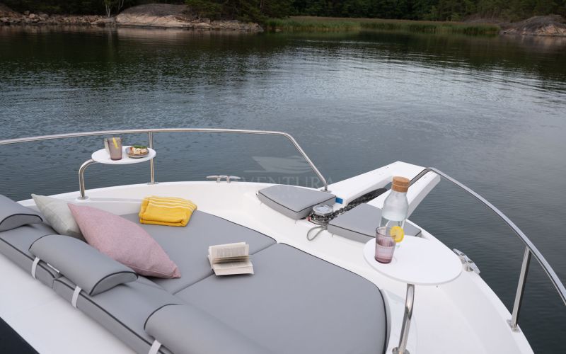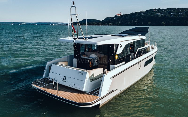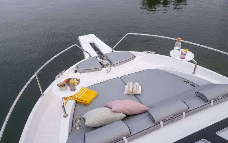 The Delphia 11 Sedan is conceived for peaceful, eco‑minded cruising, combining sleek, modern lines with great experience on the water. Designed by Tony Castro Yacht Design, its hull integrates oversized rubber rub strakes for added protection and to subtly accentuate the yacht's elegant profile, ideal for frequent docking in marinas or along quays. A generous bow area with raised sunloungers, optional removable awning and integrated trays transforms the foredeck into a welcoming relaxation zone where guests can unwind close to the water.