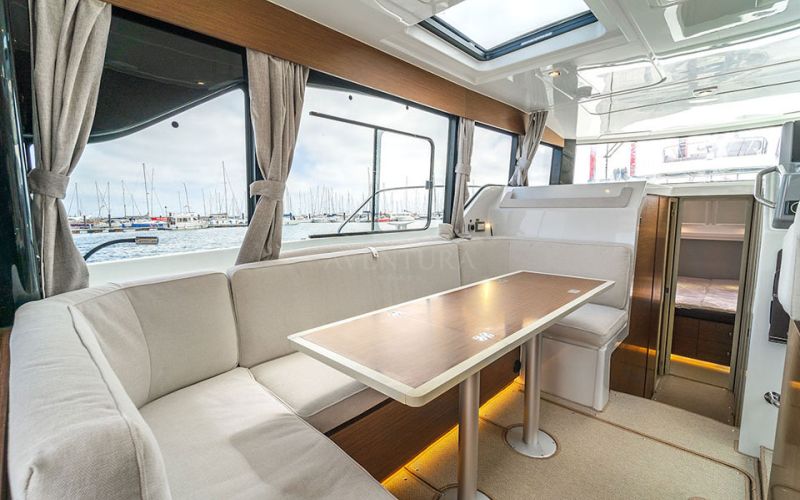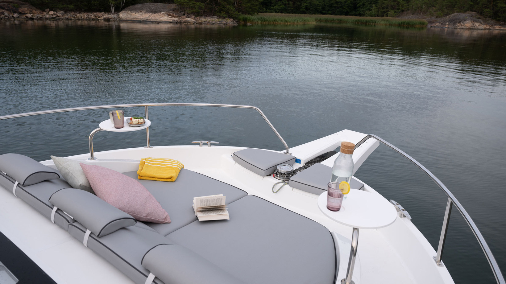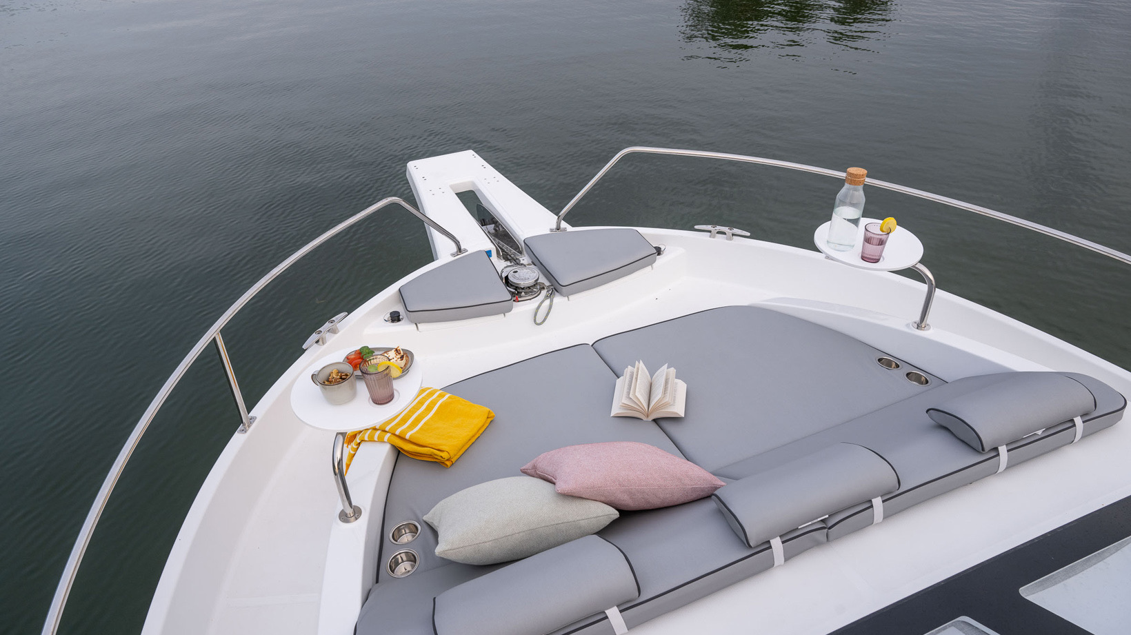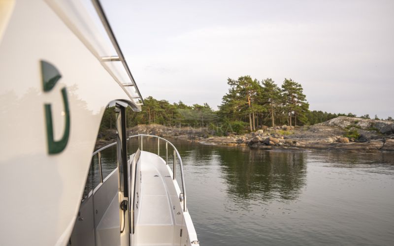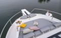 The Delphia 11 Sedan is conceived for peaceful, eco‑minded cruising, combining sleek, modern lines with great experience on the water. Designed by Tony Castro Yacht Design, its hull integrates oversized rubber rub strakes for added protection and to subtly accentuate the yacht's elegant profile, ideal for frequent docking in marinas or along quays. A generous bow area with raised sunloungers, optional removable awning and integrated trays transforms the foredeck into a welcoming relaxation zone where guests can unwind close to the water.