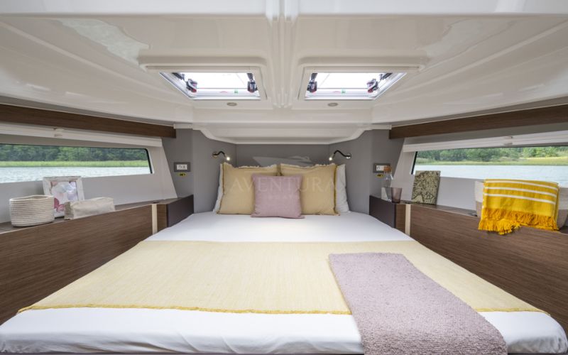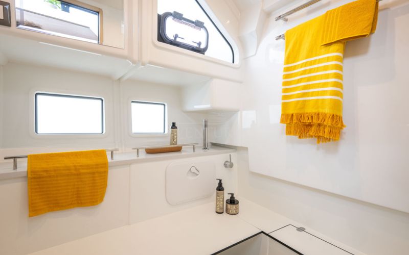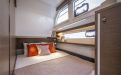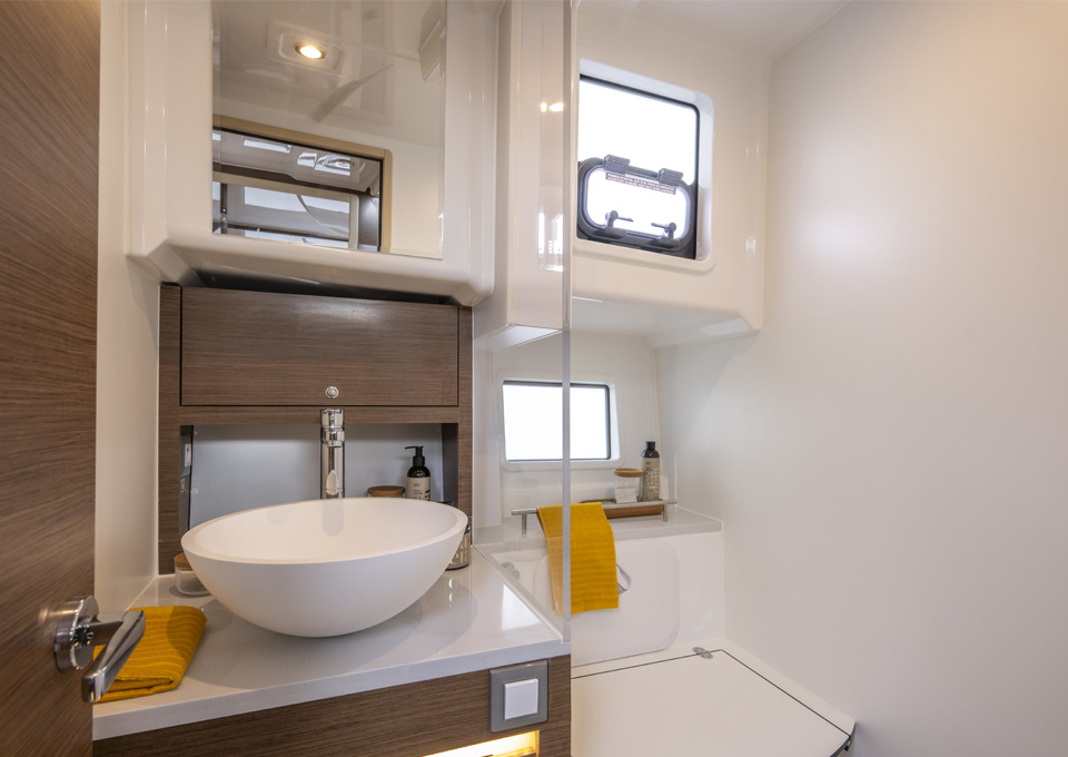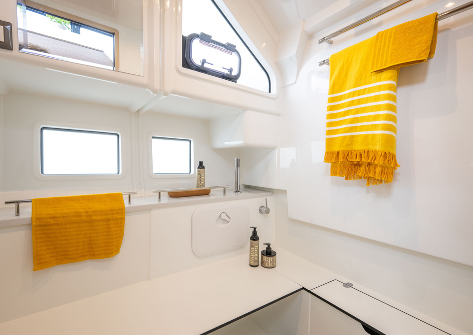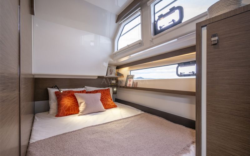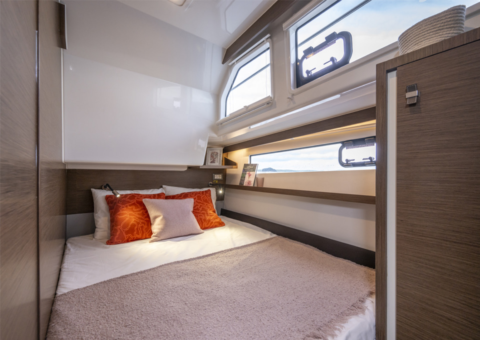 Below, the Delphia 11 Sedan offers a range of thoughtfully planned layouts, from a spacious single‑cabin arrangement with office/utility room and separate shower, through versatile two‑cabin configurations with one or two bathrooms, up to a three‑cabin, two‑head option with identical forward cabins. Each cabin is designed around generous double berths, ample storage and natural light, with bathrooms featuring separate shower stalls for added comfort. A fully equipped galley, complemented by a smart 12V to 230V inverter for domestic appliances, allows owners to enjoy everyday rituals at anchor, while the integrated photovoltaic system extends time away from marinas, in line with Delphia's philosophy of slow, mindful cruising.