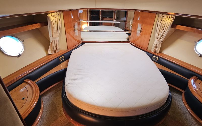 The flybridge is a true highlight, spacious and versatile, fitted with a bimini top, ample seating, and a hydraulic tender crane, creating the perfect environment for entertaining or relaxing at anchor. The yacht is further equipped with bow and stern thrusters, ensuring effortless manoeuvrability, while upgrades such as new Raymarine navigation, radar, and autopilot provide modern navigation confidence.