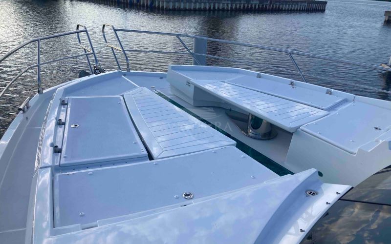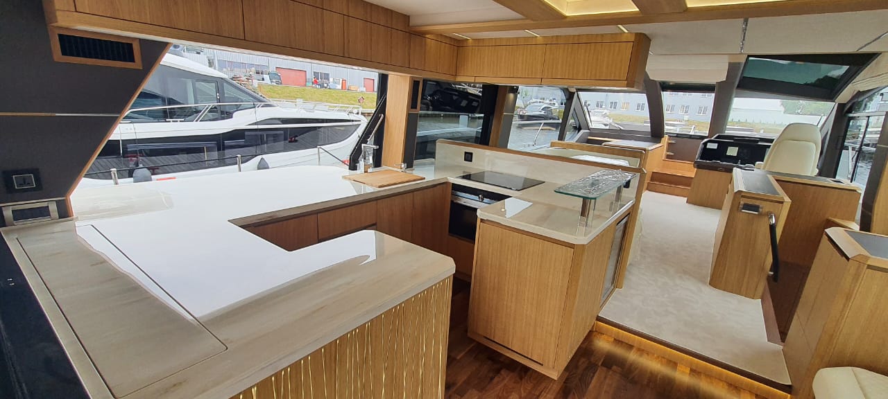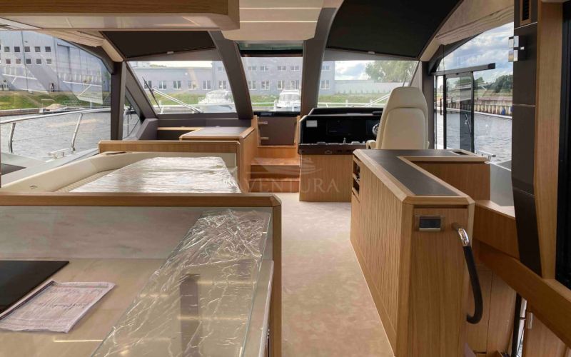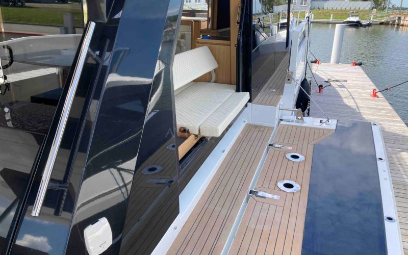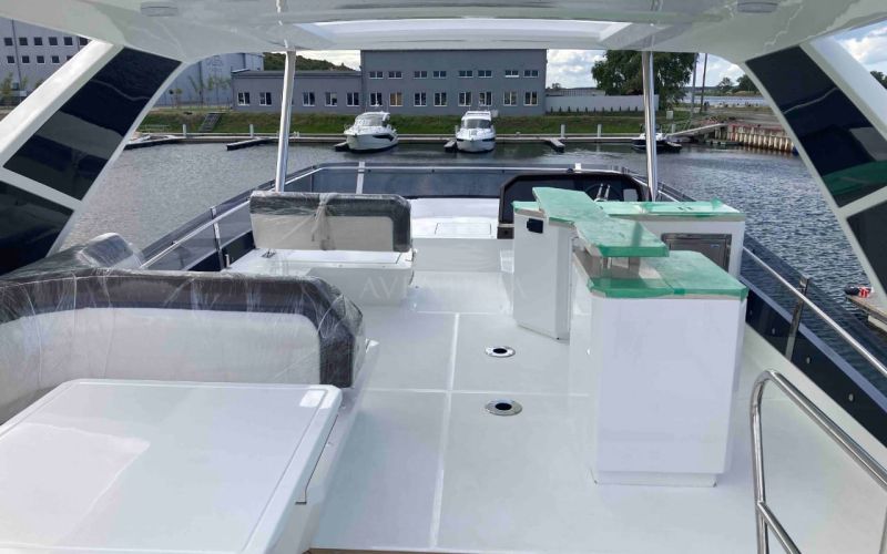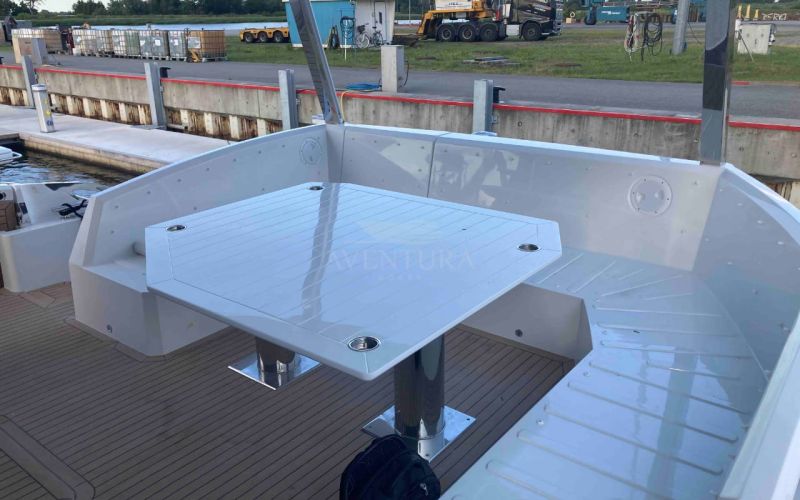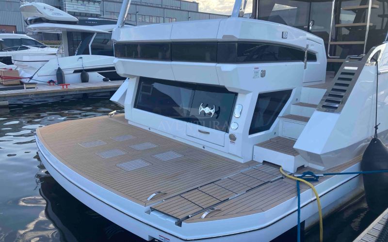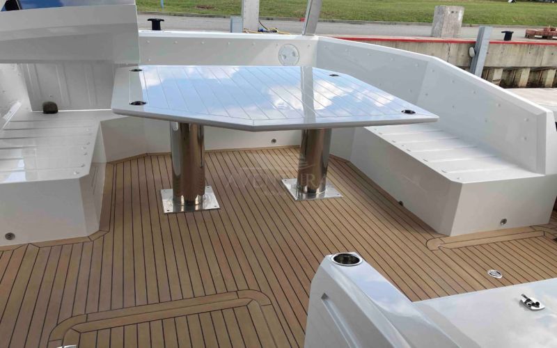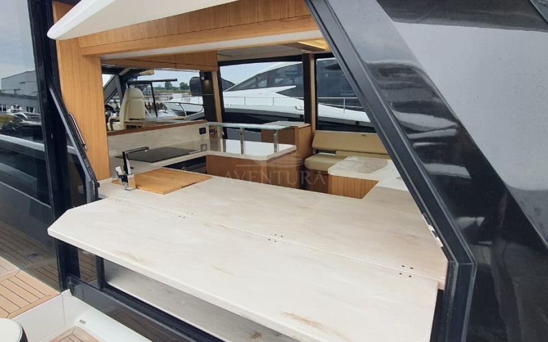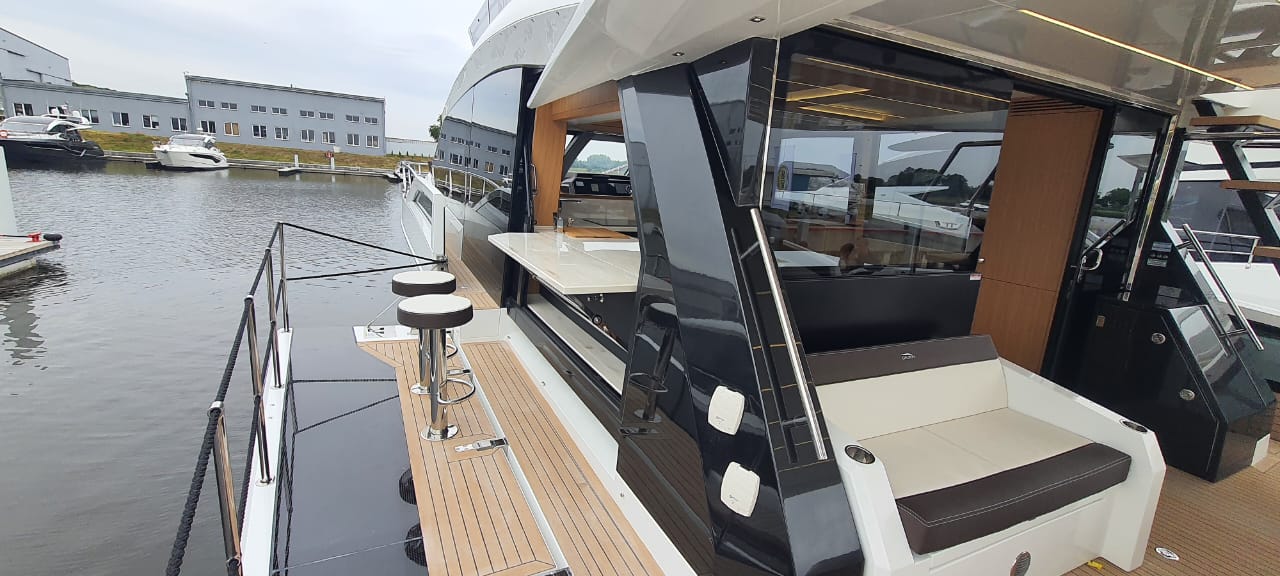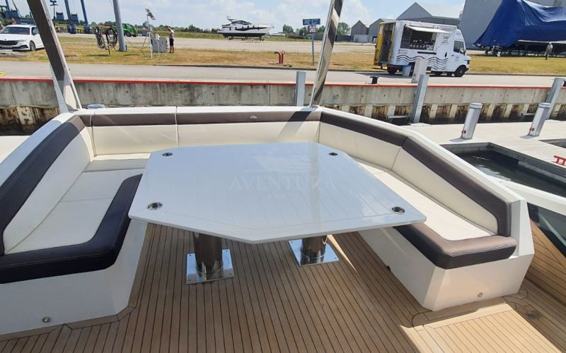 - extended aft cockpi and aft flybridge with enlarged sofas and tables + aft sunshade + aft storage access
