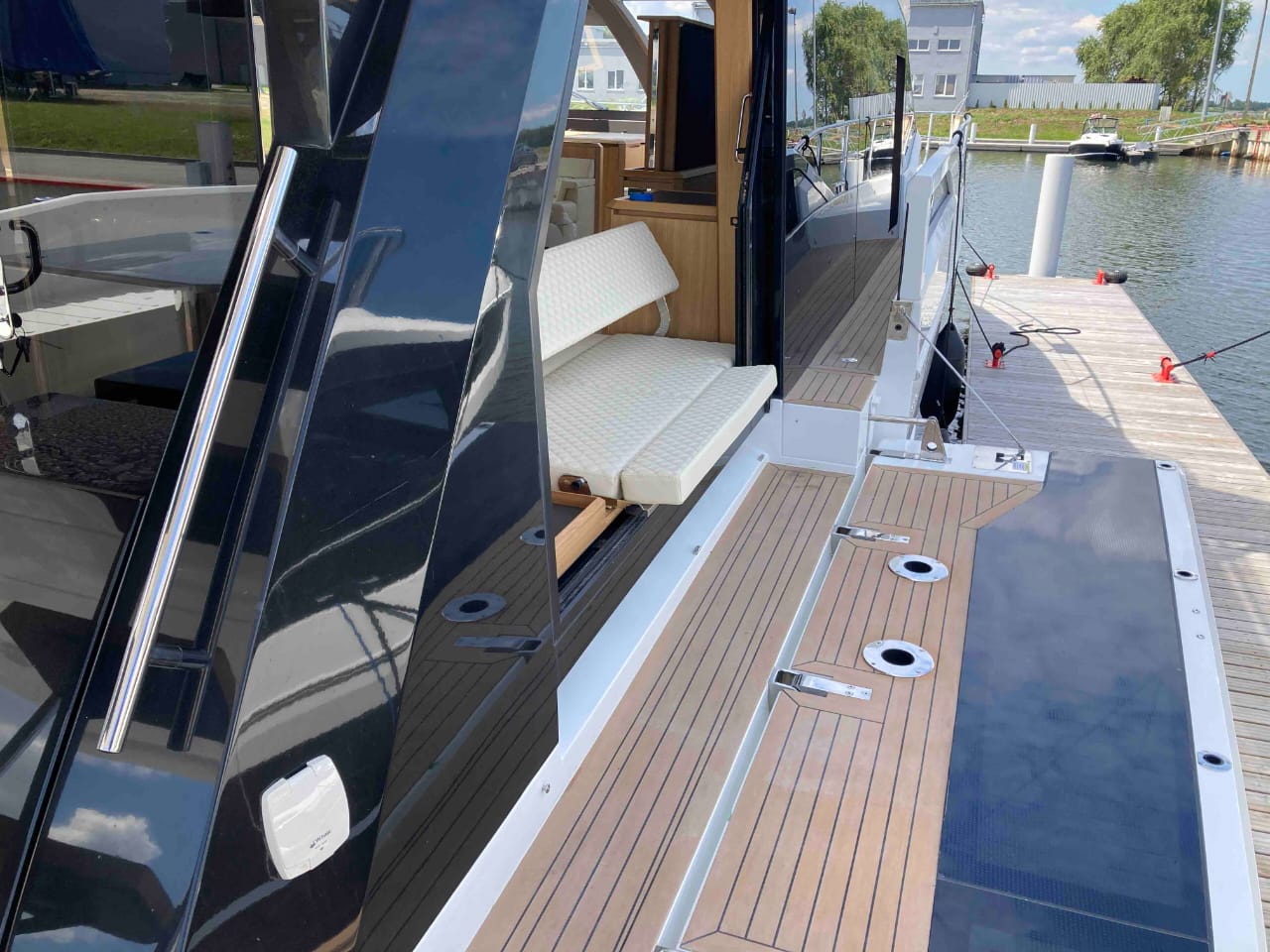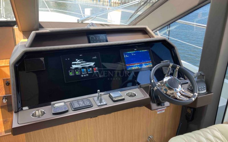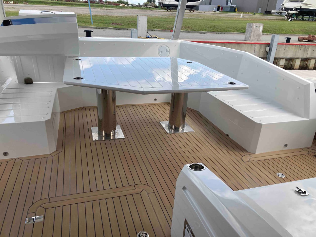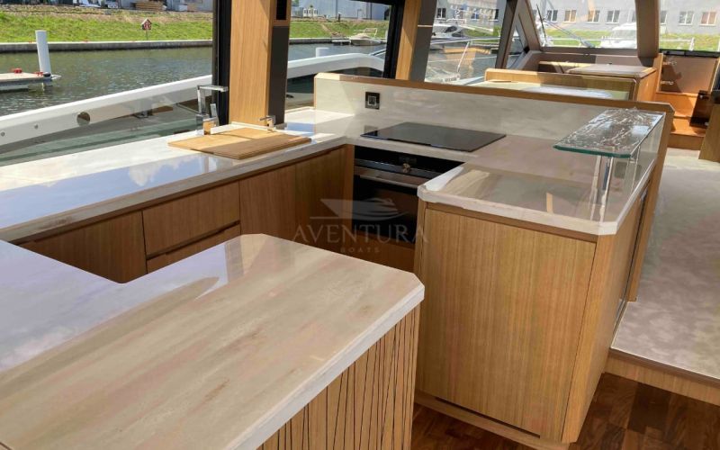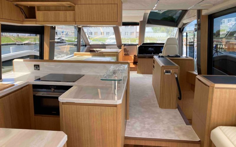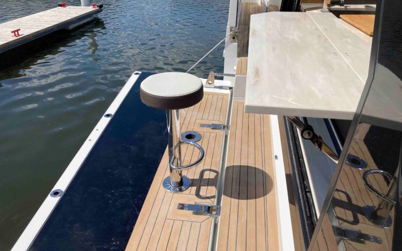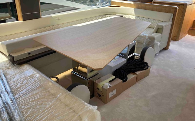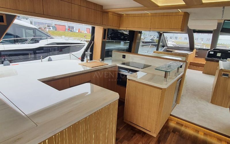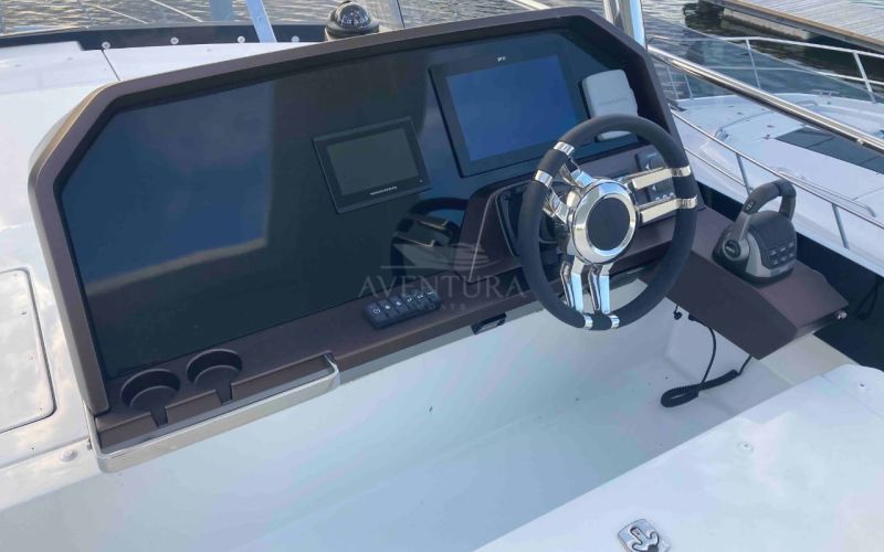 - extended aft cockpi and aft flybridge with enlarged sofas and tables + aft sunshade + aft storage access