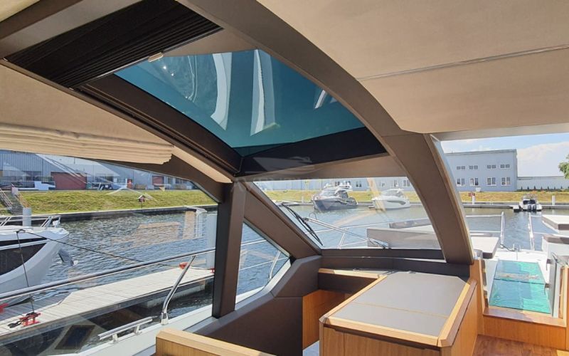 • Laminated hardtop on flybridge with electric soft roof