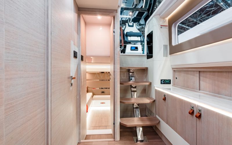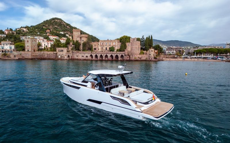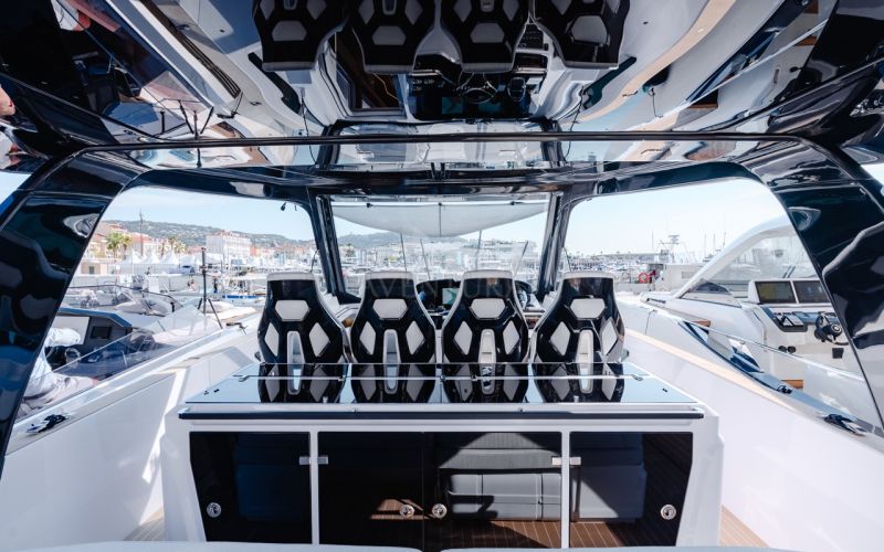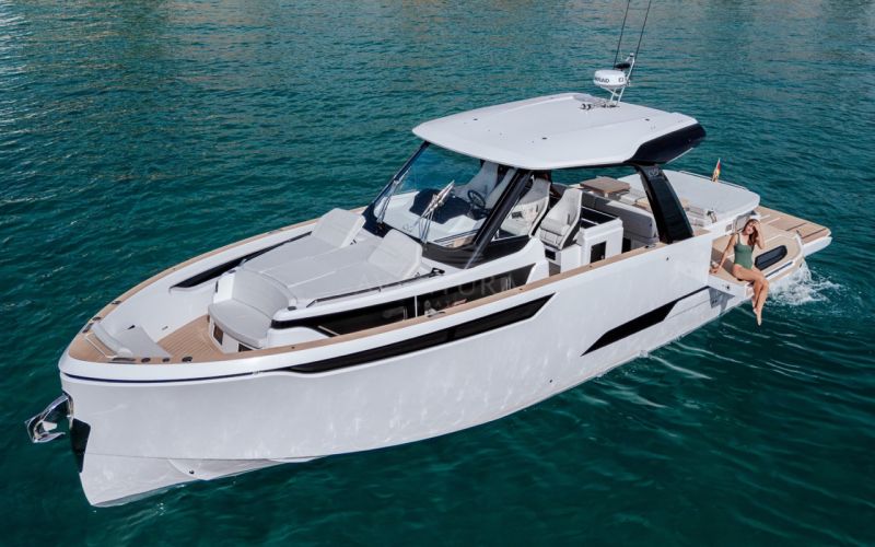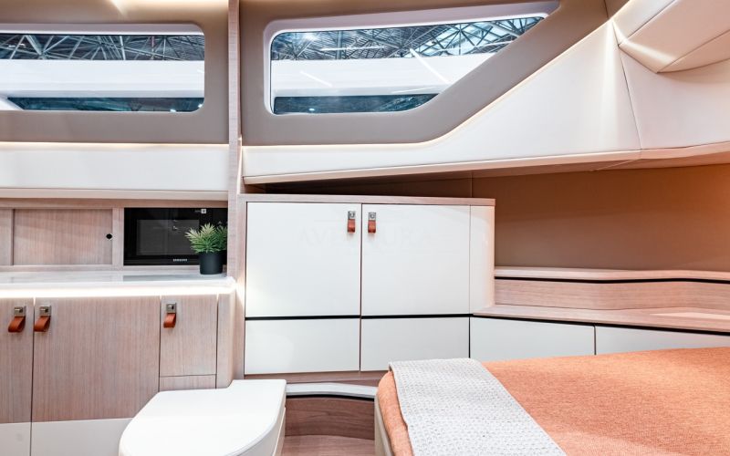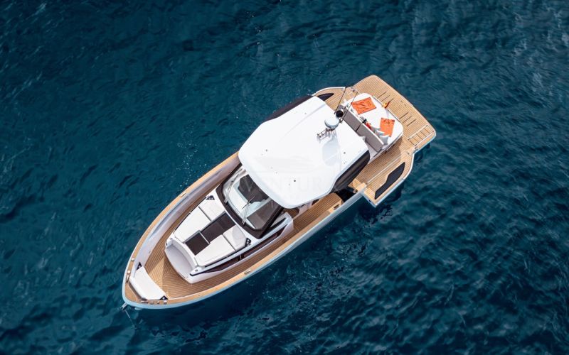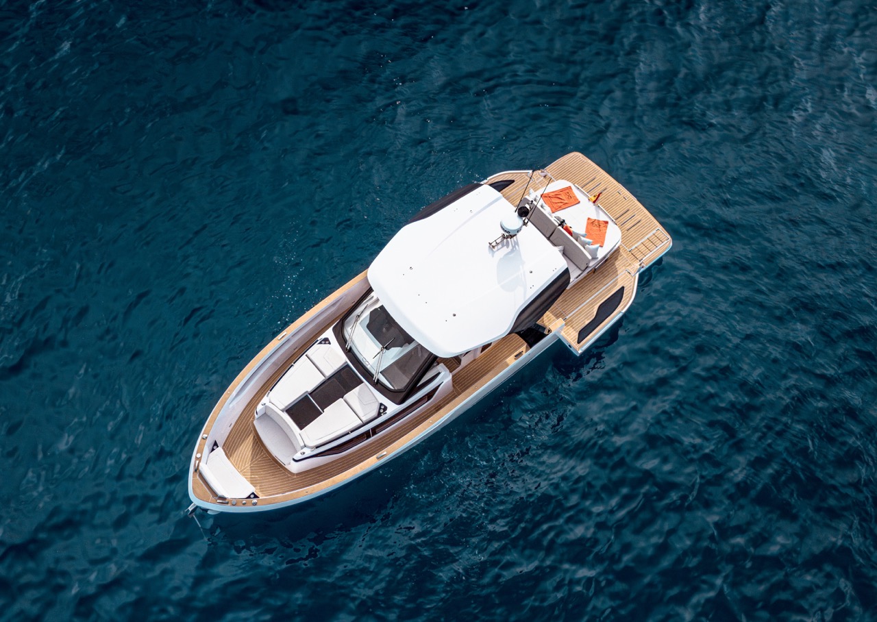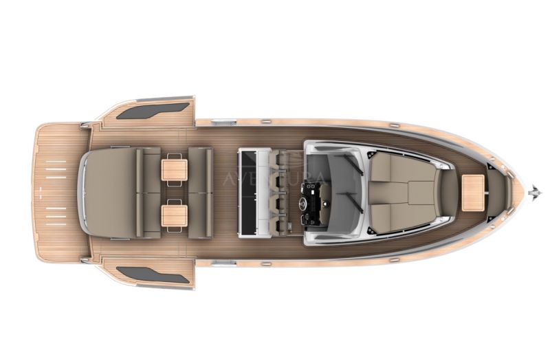 Exteriérový profil je čistý a dynamický, s výrazným presklením a vyváženou siluetou. Kokpit predstavuje skutočné centrum spoločenského života – ponúka veľkorysé sedenie, flexibilnú jedálenskú zónu a plynulý prístup na kúpaciu platformu, čo je ideálne na zábavu s priateľmi alebo na užívanie si dlhých letných dní na kotve.