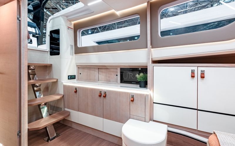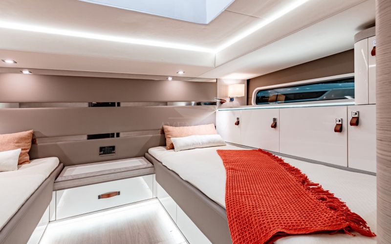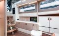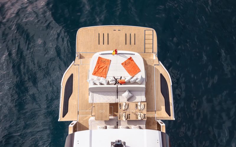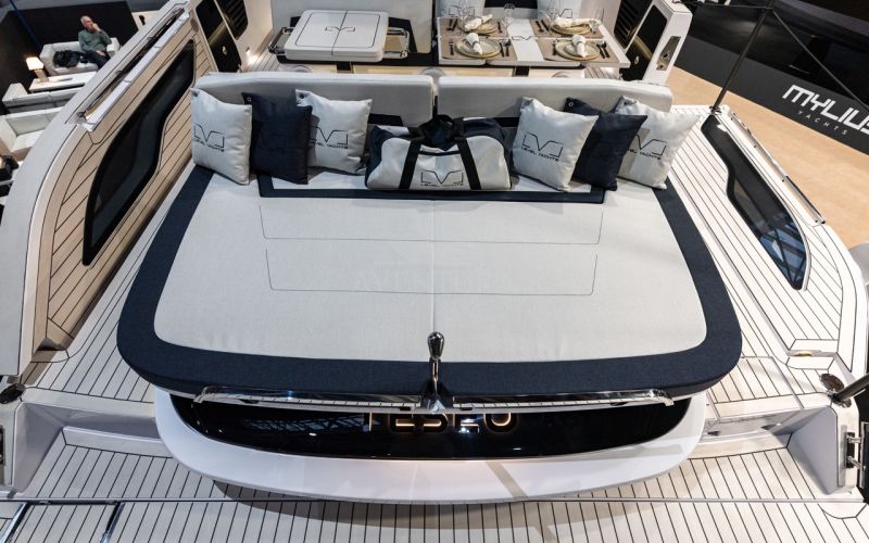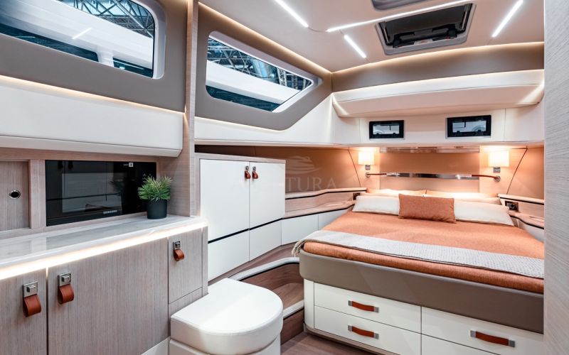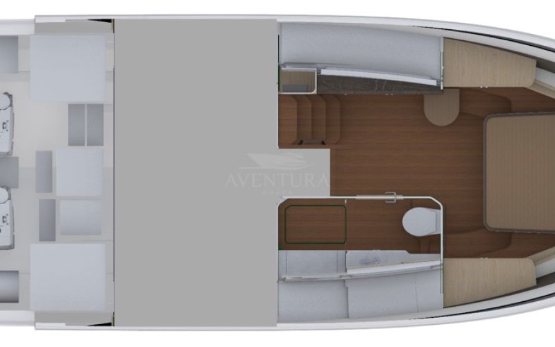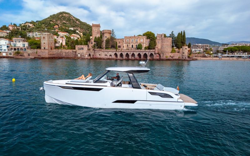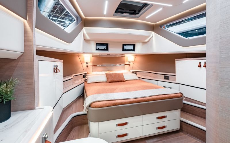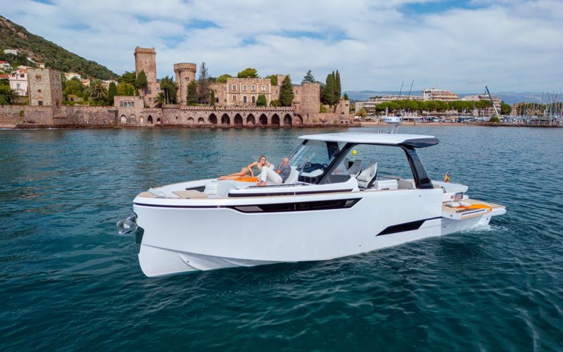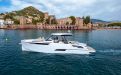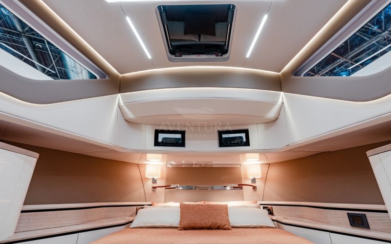 Exteriérový profil je čistý a dynamický, s výrazným presklením a vyváženou siluetou. Kokpit predstavuje skutočné centrum spoločenského života – ponúka veľkorysé sedenie, flexibilnú jedálenskú zónu a plynulý prístup na kúpaciu platformu, čo je ideálne na zábavu s priateľmi alebo na užívanie si dlhých letných dní na kotve.