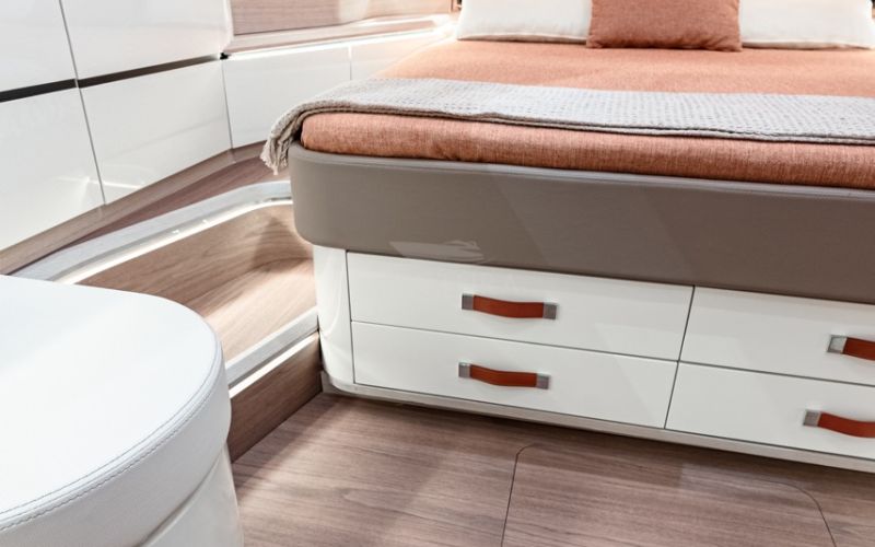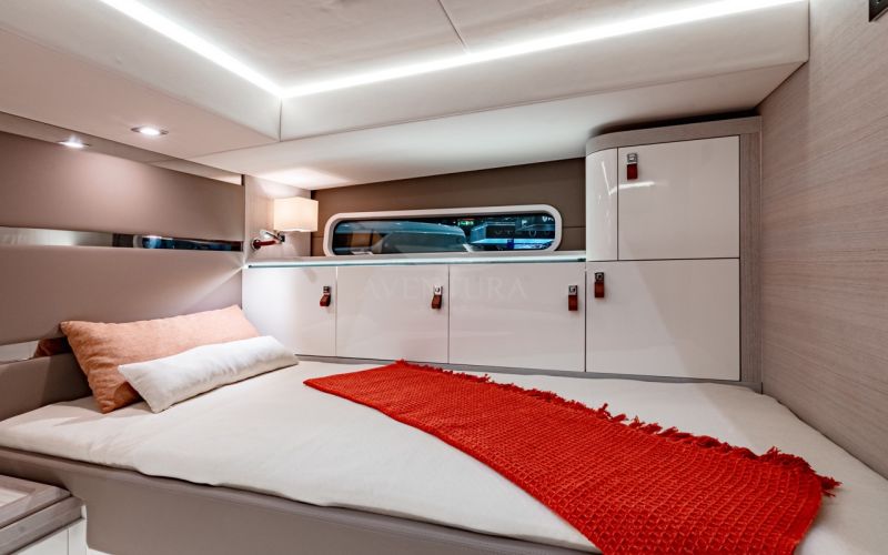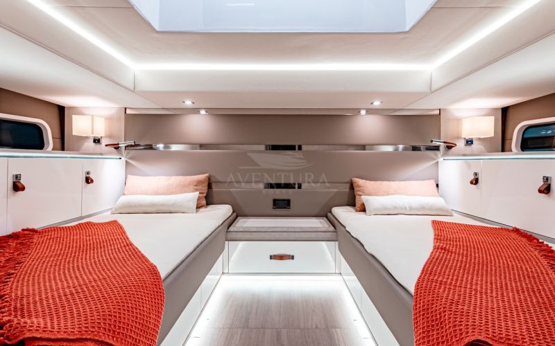 • Predná (bow) majiteľská kajuta, kúpeľňa s oddeleným sprchovým kútom a zadná úložná kajuta